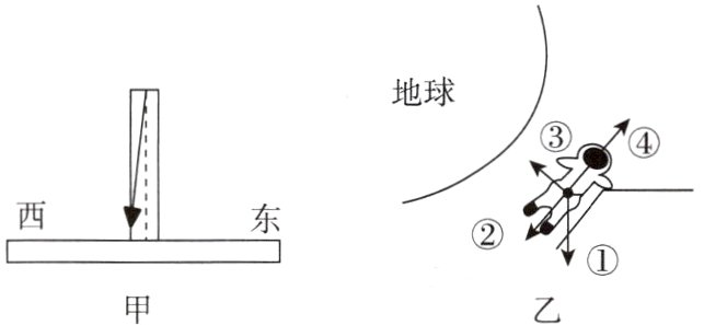 5.[2024·揭阳一模]铅垂线是利用重力方向是__________的原理制成的。如图甲所示的水平仪可以检验一个平面是否水平,若把它按东西方向放置,铅垂线锥体偏向水平仪中央刻度线的左方,说明此平面__________(选填“东”或“西”)侧偏高。如图乙所示为王亚平出舱活动时的情境,图中__________(填序号)能表示她受到的重力的方向。