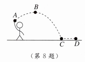8.[2024·枣庄]在体育测试中,小明同学掷实心球的场景如图所示,图中A点是球刚离开手的位置,球从A点上升到最高点B后下落到地面C点,然后滚动到D点停止。下列说法正确的是( )