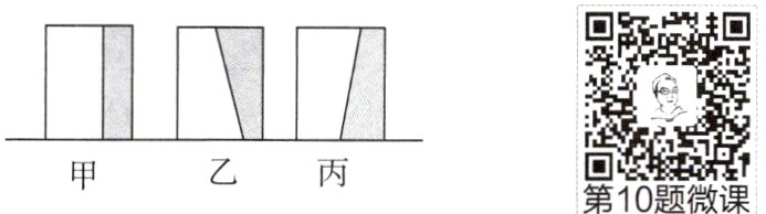 10. 如图所示,小胡将三个完全相同的长方体木块竖放在水平面上,然后将阴影部分切去,木块甲对水平面的压强________(选填“增大”“减小”或“不变”)。已知三个木块剩余部分对水平面的压强依次为p甲、p乙、p丙,那么这三个压强值中最小的是________。