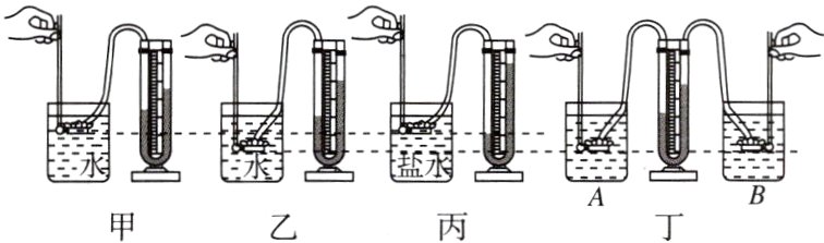 (5)(创新装置)根据实验结论对压强计进行改装,改装后可用于比较不同液体的密度大小。现将压强计两个探头分别浸入酒精和水中并处于同一深度,如图丁所示,可判断出A杯中盛有________(选填“酒精”或“水”)。将A杯中的探头向________(选填“上”或“下”)移,U形管两侧液面会再次相平。