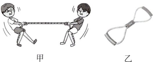10. [2024·上饶期中]如图甲所示的是聪聪和明明进行拔河比赛的情景,最终明明获胜,比赛过程中,绳子拉聪聪的力________(选填“大于”“小于”或“等于”)聪聪拉绳子的力。拔河比赛后,二人又用如图乙所示的“8”字形弹性橡胶拉力器比试臂力,若聪聪把弹性橡胶拉力器拉得更长,则____________的臂力更大。