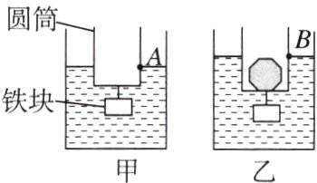 (2)图乙中圆筒底部受到水的压强p=ρ_{水}gh=1.0×10^{3} kg/m^{3}×10N/kg×10×10^{-2} m=1000Pa,受到水的压力F=pS=1000Pa×10×10^{-4} m^{2}=1N。