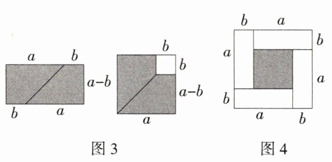(2)用4个完全相同且长和宽分别为$a$和$b$的长方形纸片拼成一个如图4所示的正方形纸片,请你通过计算阴影部分的面积,直接写出$(a + b)^2$,$(a - b)^2$,$ab$之间的等量关系.