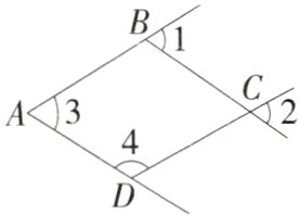 4.教材变式 如图所示的是由四条射线构成的“鱼”形图案,已知∠1 = 40°,∠2 = 40°,∠4 = 140°,求∠3的度数.