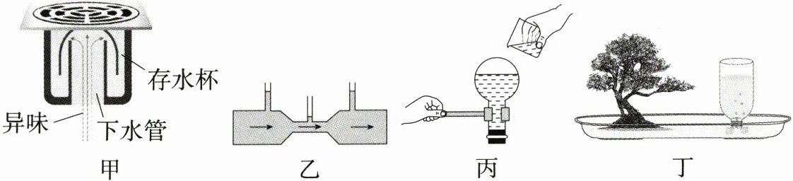 D. 丁:盆景自动供水装置中水不会流下来——瓶外大气压小于瓶内的气压