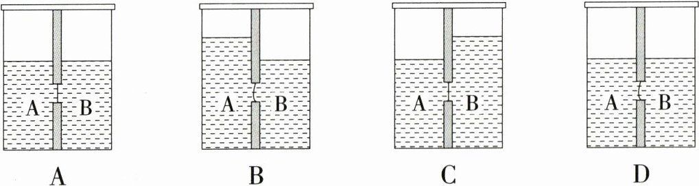 5.(教材变式,★☆)如图所示,甲图中容器可以用来做“探究液体压强是否与液体深度、液体密度有关”的实验。下列是某实验小组根据图乙给出的信息,探究液体压强与液体密度关系的实验装置图,当左右两侧各注入适量的A、B两种液体后,符合实际情况的是 ( )