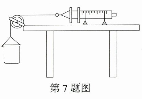 7.(2024黑龙江大庆模拟,8,★☆)在测量大气压的实验中,为消除活塞与针筒间的摩擦力对实验的影响,某同学采用了图示装置,把活塞推至注射器针筒底端,用橡皮帽封住注射器的小孔,活塞通过水平细线与烧杯相连,向烧杯中缓慢加水,当活塞刚开始向左滑动时,测得杯中水的质量为880 g;然后从杯中向外缓慢抽水,当活塞刚开始向右滑动时,测得杯中水的质量为460 g,烧杯质量为100 g,活塞横截面积为$7×10^{-5}\mathrm{m}^2$,$g$取10 N/kg,滑轮与绳、轴间的摩擦和细线重不计,则所测大气压的值应为 ( )
