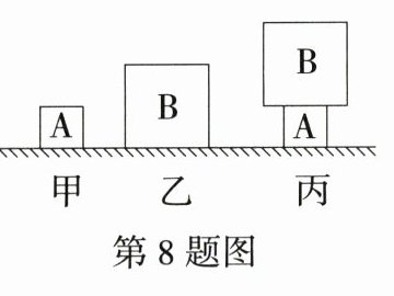 8.(2024山东泰安模拟,13,★★)有A、B两个相同材料的均匀实心正方体,A的棱长为0.1 m,B的棱长为0.2 m,A对桌面的压强为$p_1$,B对桌面的压强为$p_2$;若按图丙的方式放置时,B对A的压强为$p_3 = 2.4×10^4$ Pa,A对桌面的压强为$p_4$,$g$取10 N/kg。下列判断正确的是 ( )
