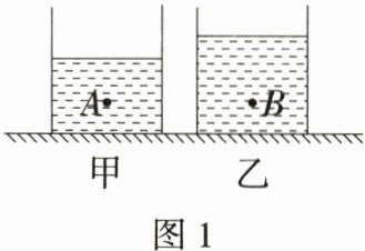 15.(2024广东广州模拟,14,★★)(1)两个完全相同的圆柱形容器静止放在水平桌面上,其中甲容器中装有水,乙容器中装有其他液体,两容器液面高度如图1所示。A点距离水面的高度为5 cm,5 cm水柱所产生的压强$p_A =$____Pa。液体内A、B两点压强分别为$p_A$、$p_B$,若$p_A = p_B$,则$\rho_乙$____(选填“>”“<”或“=”)$\rho_水$。($g = 10$ N/kg)