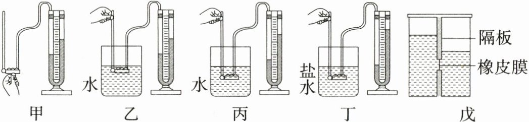 (5)同学们用图戊所示的装置测量未知液体的密度:在左侧加入适量的水,在右侧缓慢倒入待测液体,直到橡皮膜刚好变平,并测量了以下物理量。