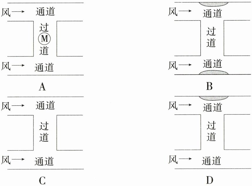 5.(跨学科 物理学与工程实践)(★☆☆)为解决地下“工”字形过道的通风问题,小明设计了如下四种方案。图中灰色部分为墙体凸出部分,M为安装在过道顶的换气扇。下列方案中既有效又节能的是 ( )