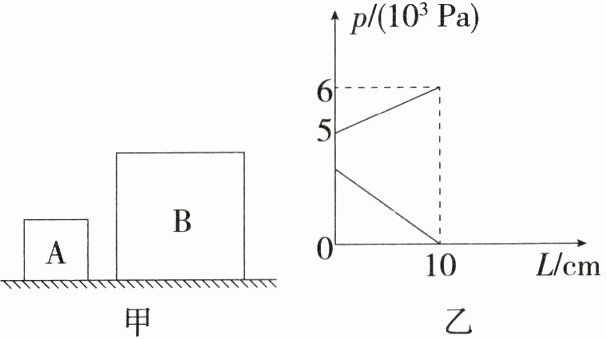 8.(2024河北石家庄期中,16,★☆☆)(多选)如图甲所示,两个质量分布均匀的正方体A、B放在水平地面上,A、B对地面的压强之比为4 : 5,将A沿水平方向切去高为L的部分,把切去部分叠放在B上,此时B对地面的压强为pB,A剩余部分对地面的压强为pA,pA、pB与L的变化关系如图乙,g取10 N/kg。下列分析正确的是 ( )