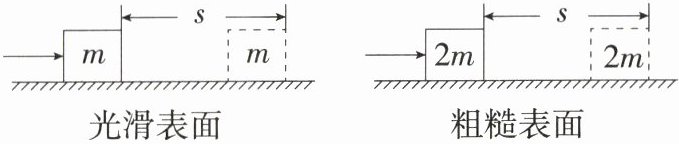 5.(2024江苏连云港中考,9,★☆)如图所示,一个人先后两次用同样的时间、同样大小的力,将不同质量的物体在不同的表面上分别移动相同的距离。该力在此过程中所做功的大小分别为W₁、W₂,功率的大小分别为P₁、P₂,关于它们之间的大小关系说法正确的是 ( )
