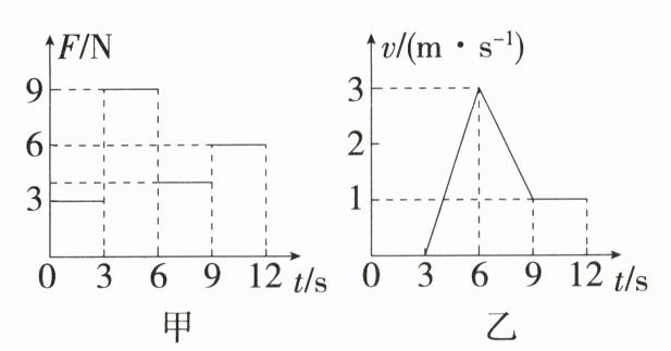 D@@由图乙知,0到3 s内,物体速度为0,处于静止状态,没有在拉力F的方向上移动距离,拉力不做功;由图甲可知,3 s到6 s内,拉力为9 N,由图乙知,3 s到6 s内,物体运动速度逐渐增大,由P = $\frac{W}{t}$ = $\frac{Fs}{t}$ = Fv可知,功率逐渐变大;由图甲可知,9 s到12 s内,拉力为F = 6 N,由图乙可知,9 s到12 s内,物体做匀速直线运动,v = 1 m/s,所以,9 s到12 s内物体移动的距离s = vt = 1 m/s×3 s = 3 m,则拉力对物体做功W = Fs = 6 N×3 m = 18 J,由P = $\frac{W}{t}$ = $\frac{Fs}{t}$ = Fv可知,功率P = 6 N×1 m/s = 6 W。