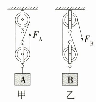 14.(2024黑龙江哈尔滨平房模拟,12,★☆☆)(多选)如图所示,用相同的滑轮安装成甲、乙两种装置,分别用拉力Fₐ、Fᵦ匀速提升重力为Gₐ、Gᵦ的A、B两个物体。相同时间内,物体提升相同高度,不计绳重和摩擦。下列说法正确的是 ( )