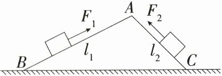 9.(2024安徽天长期末,21,★☆☆)如图所示,光滑斜面AB、AC的长度分别为l₁、l₂,且l₁>l₂,沿斜面AB和AC分别将同一重物从它们的底部以相同速度拉到顶部,所需拉力分别为F₁和F₂,所做的功分别为W₁和W₂,其功率分别为P₁和P₂,则 ( )