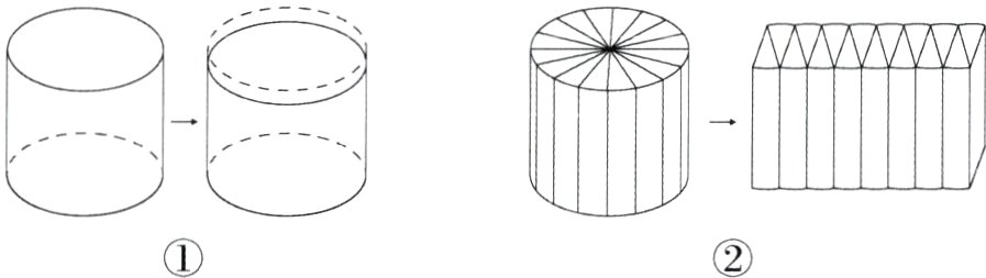 9. 一个圆柱,如果把它的高截短3厘米(如图①),表面积就减少94.2平方厘米,那么这个圆柱的底面半径是( )厘米。如果把原来的圆柱平均分成16份后拼成一个近似的长方体(如图②),表面积就比原来增加100平方厘米,那么原来圆柱的体积是( )立方厘米。