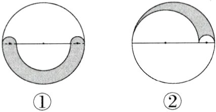 3. 如图,有2个大小相同的圆,分别在其中绘出不同的图案,它们阴影部分的周长相比,( )。