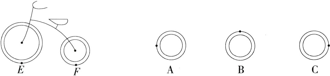 6. 新情境 生活情境 如图,自行车的前轮半径为30厘米,后轮半径为20厘米。当前轮向前行驶了5圈回到E点的位置时,后轮F点的位置是图中的( )。