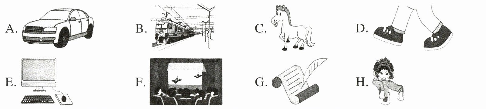 十一、(西安市期末真题)我会阅读短文,选择合适的图片完成表格。(只写字母标号) (每空1分,共8分)