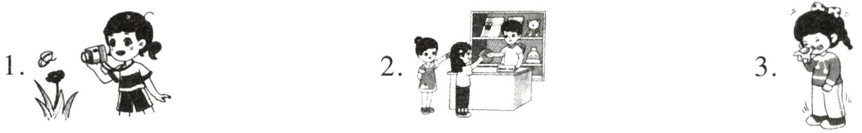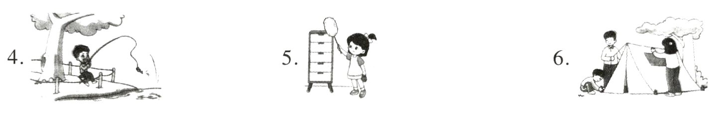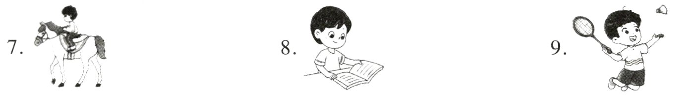 1. took pictures;2. bought gifts;3. has a cold;4. went fishing;5. cleaning the room;6. goes camping;7. rode a horse;8. reading a book;9. plays badminton