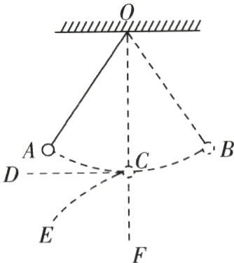 13. 〔科学实践〕如图所示,在竖直平面内用轻质细线悬挂一个小球,将小球拉至$A$点,使细线处于拉直状态,由静止释放小球,不计摩擦,小球可在$A$、$B$两点间来回摆动. 当小球摆到$B$点时,同时假如所有力都消失,则小球将______,其原理是__________;当小球从$B$点摆到$C$点,同时假如所有力都消失,此时小球将______________________________(选填“沿$CD$方向匀速运动”“沿$CE$方向匀速运动”或“沿$CF$方向匀速运动”).