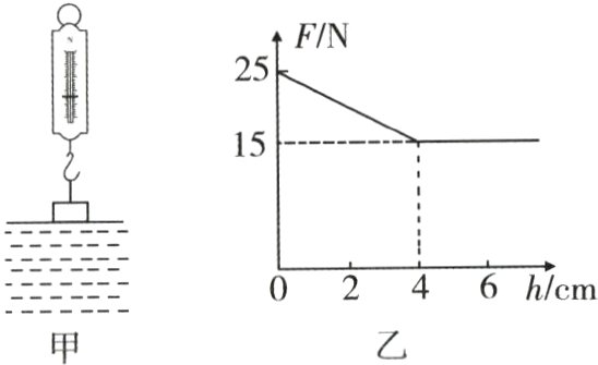 C [解析]由图乙可知,物体的重力$G = F = 25N$,A错误;当物体完全浸入水中时,弹簧测力计的示数$F' = 15N$,物体浸没时受到的浮力$F_{浮}=G - F' = 25N - 15N = 10N$,B错误;物体的质量$m=\frac{G}{g}=\frac{25N}{10N/kg}=2.5kg$,物体浸没在水中,根据$F_{浮}=\rho_{液}gV_{排}$可得,物体的体积$V = V_{排}=\frac{F_{浮}}{\rho_{水}g}=\frac{10N}{1.0\times10^{3}kg/m^{3}\times10N/kg}=1\times10^{-3}m^{3}$,则物体的密度$\rho_{物}=\frac{m}{V}=\frac{2.5kg}{1\times10^{-3}m^{3}}=2.5\times10^{3}kg/m^{3}$,C正确;由图乙知,物体刚浸没时下表面所处的深度$h = 4cm = 0.04m$,则物体刚浸没时下表面受到的液体压强$p=\rho_{水}gh=1.0\times10^{3}kg/m^{3}\times10N/kg\times0.04m = 400Pa$,D错误.