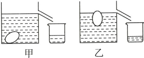 B [解析]由图甲可知,鸡蛋在水中沉入水底,由图乙可知,鸡蛋在盐水中漂浮,根据物体的沉浮条件可知,鸡蛋在水中受到的浮力$F_{1}<G$,在盐水中受到的浮力$F_{2}=G$,所以鸡蛋在水中受到的浮力小于在盐水中受到的浮力,即$F_{1}<F_{2}$,A错误;鸡蛋浸没在水中,鸡蛋的体积$V = V_{排}=\frac{m_{排}}{\rho_{水}}=\frac{G_{1}}{g\rho_{水}}$,B正确;根据阿基米德原理和物体的沉浮条件可知,鸡蛋的重力$G = G_{2}$,由$G = mg$可知,鸡蛋的质量$m=\frac{G_{2}}{g}$,则鸡蛋的密度$\rho=\frac{m}{V}=\frac{\frac{G_{2}}{g}}{g\frac{G_{1}}{g\rho_{水}}}=\frac{G_{2}}{G_{1}}\rho_{水}$,C、D错误.