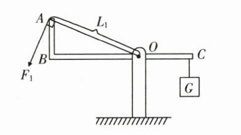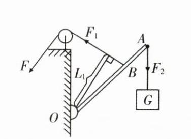 9.工程实践如图是一个轻质杠杆式简易起吊机,它上面装了一个定滑轮可以改变拉绳的方向,杠杆OBA可绕O点转动.请在图上画出杠杆所受的阻力F₂和动力的力臂L₁.