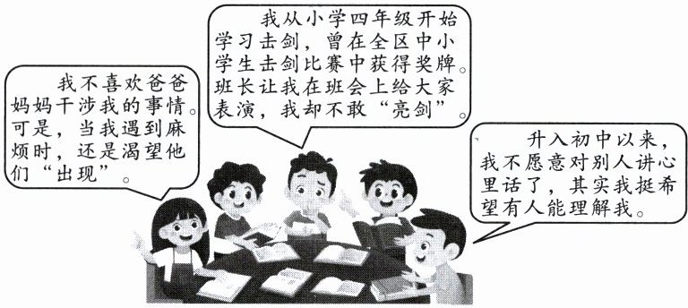 材料一 七年级(1)班的一个学习小组针对“青春期的心理变化”展开探究,请你参与其中。
