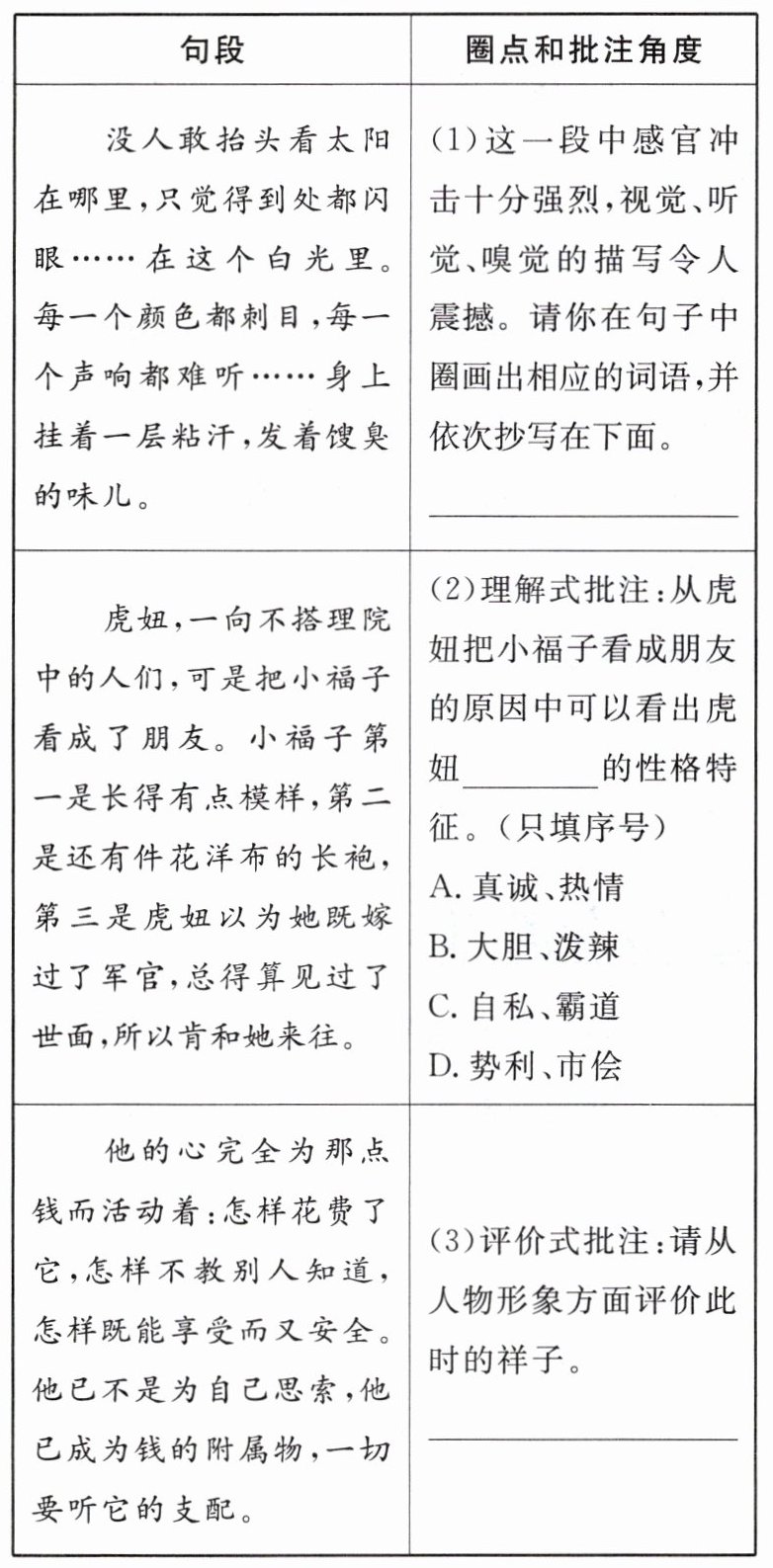 3.(四川自贡中考)圈点批注法是古人读书时常用的传统方法,小明就用这种方法阅读《骆驼祥子》。请根据提示,帮助小明完成阅读批注。