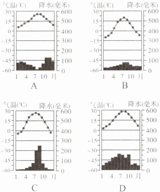 5.下列四幅气温曲线和降水量柱状图中,可能属于我国南方地区的是 ( )
