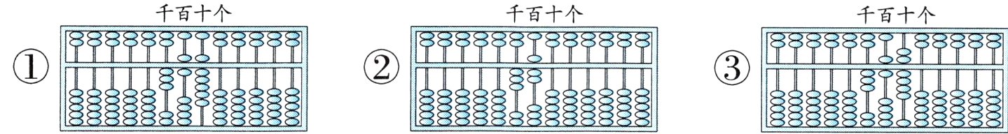 (2)再在十位拨上1个下珠,算盘上的珠子应该拨成( )。