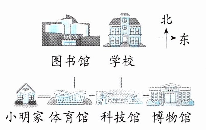 (1)博物馆在科技馆的( )面,学校在科技馆的( )面,体育馆在科技馆的( )面。