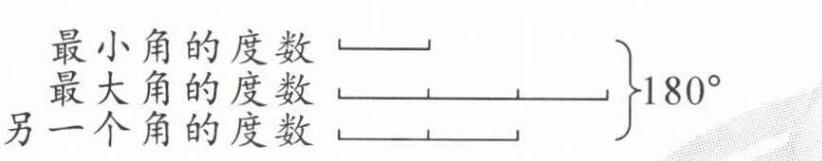 6.新角度 在一次手工制作活动中,萌萌用卡纸做了一个三角形书签,书签最大角的度数是最小角的3倍,另一个角的度数是最小角的2倍。这个三角形书签的三个角分别是多少度?(先将下图补充完整,再解答)