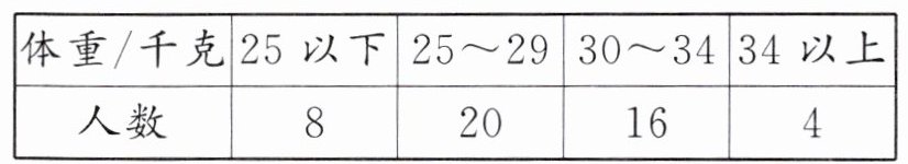 (2)体重在34千克以上的有( )人,在25千克以下的有( )人,体重在( )范围内的人数最多。