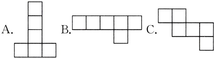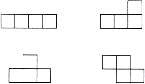 5. 新角度 下图为俄罗斯方块中四个基本图形,请添上一个小正方形,使得它们能折叠成一个无盖的正方体。(主要对应目标:5202)