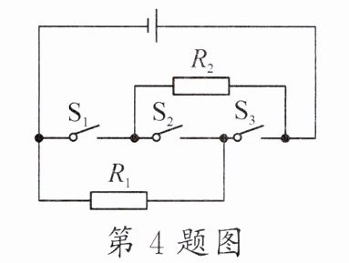 4.如图所示的电路中,电源电压U = 10V,R₁ = 5Ω,R₂ = 20Ω。只闭合S₁时,电路中的工作电流是______A;当只闭合S₂时电路的消耗总功率为P,只闭合S₁和S₃时电路消耗的总功率为P',则两次功率之比P:P'等于__________。