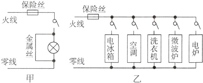 8. 如图所示的甲、乙两个电路,闭合开关后都会使得保险丝熔断。关于保险丝熔断的原因,下列说法正确的是( )