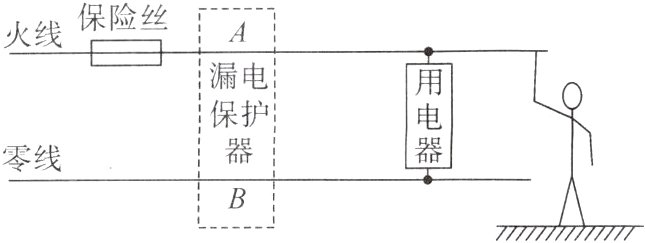(2) 若此时有一人赤脚站在地上,不小心手接触了火线,假设人的电阻为4.4kΩ,此时通过人体的电流是0.05A,保险丝________(选填“会”或“不会”)熔断,漏电保护器检测到通过A、B两处的电流IA______(选填“>”“<”或“=”)IB,从而切断电路,保护人身安全。
