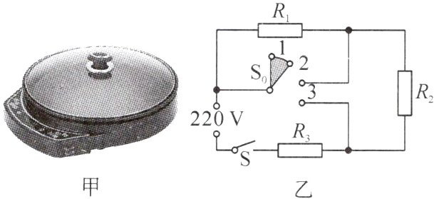 18. 如图甲所示是最大功率为1000W的电煎锅,它分为高、中、低三挡。图乙是其简化电路图,S为总开关,S₀为调挡开关,转动S₀可将开关调至1、2、3位置。R₁、R₂、R₃均为发热电阻且阻值相等。求: