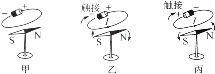 1. 如图甲所示,将一根导线平行置于静止的小磁针上方,小磁针不偏转;如图乙所示,当电源接通时,小磁针发生偏转,这说明通电导体周围存在着________;如图丙所示,将电源的正、负极对调,再接通电源,观察到小磁针的偏转方向发生改变,这说明通电导体周围的磁场方向与________有关。这就是著名的________实验。