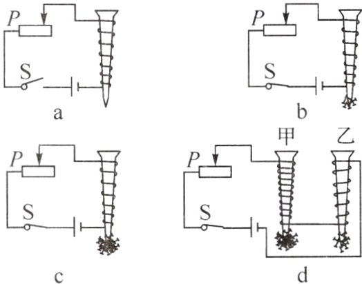 为了检验上述猜想是否正确,小丽所在实验小组通过交流与合作设计了以下实验方案:用漆包线(表面涂有绝缘漆的导线)在大铁钉上缠绕若干圈,制成简单的电磁铁。如图a、b、c、d 所示为实验中观察到的四种情况。根据小丽的猜想和实验,完成下面填空: