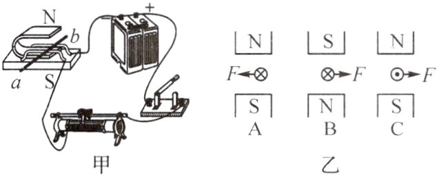 3. 如图甲所示,物理兴趣小组的同学在研究磁场对电流的作用时,确定了研究课题:磁场对电流作用力的方向与什么因素有关?他们设计了如下实验: