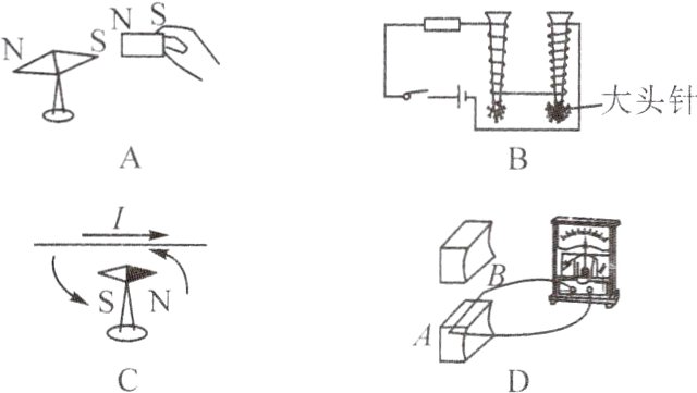 16. 用一根不知有无磁性的铁棒的A端靠近一根悬挂的条形磁铁的N极,磁铁靠近铁棒,如图甲所示,则可判断铁棒__________(选填“一定”或“不一定”)带有磁性;若改将铁棒的B端靠近悬挂的条形磁铁的N极,磁铁远离铁棒,如图乙所示,则可判断铁棒________(选填“一定”或“不一定”)带有磁性,且A端为________极。