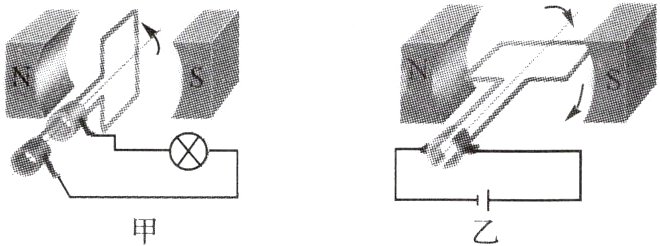 19. 如图所示是电和磁知识中的两个重要实验装置,图甲是研究在磁场中转动的线圈产生电流的情况,这种现象是________现象;图乙是研究通电线圈在磁场里受力转动的现象,__________机就是根据这一原理制成的。