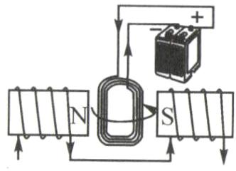20. 如图所示,根据通电线圈的扭转方向在图中画出左边螺线管的绕线方向并标出两个螺线管的N、S极和电源的正、负极。