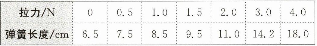 (1)由表格数据可知,当拉力为0 N时,弹簧原长为6.5 cm,拉力在0~1.5 N以内,弹簧伸长量与拉力成正比,故用该弹簧制成的弹簧测力计的最大测量值是1.5 N。
