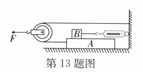 13. 小丽同学用水平力F拉动如图所示装置,使重100 N的物体A4 s内在水平地面上匀速运动了80 cm,物体B重50 N(物体B与A始终接触),此过程中地面受到的摩擦力为10 N,弹簧测力计的示数为8 N;若不计滑轮重、弹簧测力计重、绳重和绳与滑轮间摩擦,则滑轮移动的速度为 _______ m/s,物体A受到B施加的摩擦力 _______(选填“水平向左”“水平向右”或“为零”),水平拉力F为 _______ N,水平拉力F的功率为 _______ W.