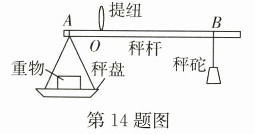 14. 科学实践 (2024·重庆中考)小兰自制了一把杆秤,由秤盘、提纽、秤杆以及200 g的秤砣构成,如图所示.当不挂秤砣、秤盘中不放重物时,提起提纽,秤杆在空中恰好能水平平衡.已知AO间距离为10 cm.当放入重物,将秤砣移至距O点30 cm的B处时,秤杆水平平衡,则重物质量为 _______ g;往秤盘中再增加20 g的物体,秤砣需要从B处移动 _______ cm才能维持秤杆水平平衡.